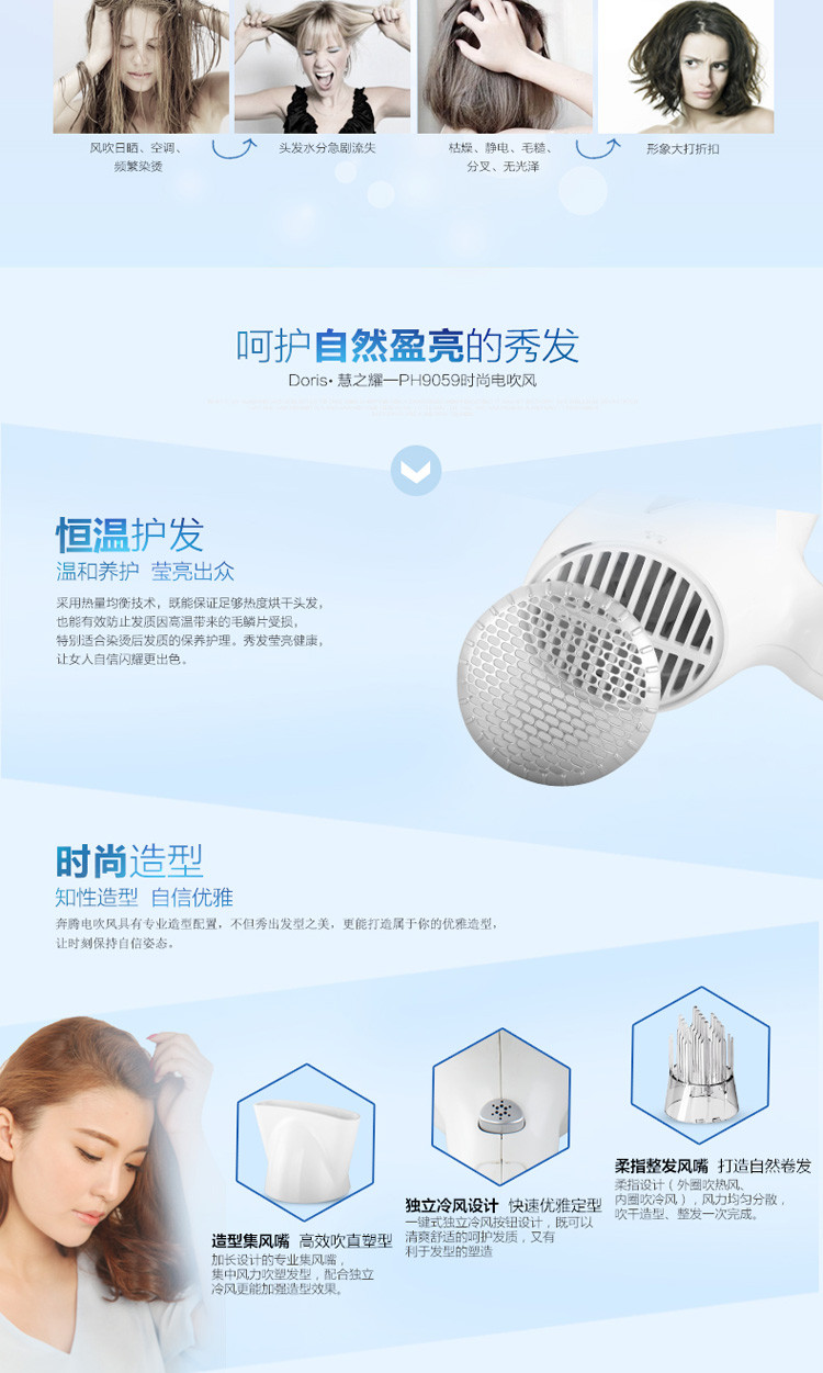 奔腾ph9059吹风机家用2200W大功率 21*25*10CM电吹风发廊理冷热风静音吹风筒