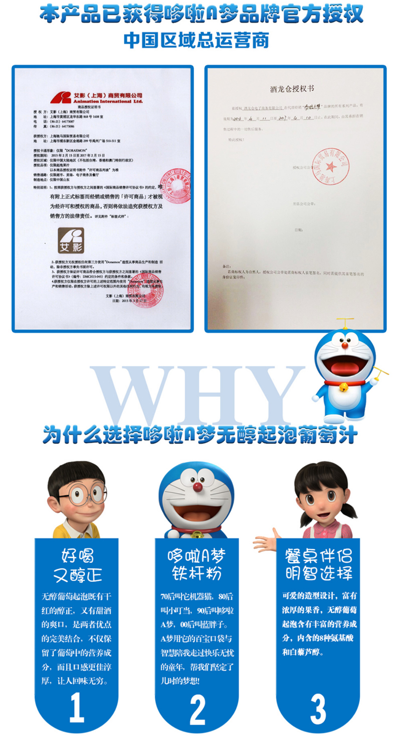 订购:哆啦a梦无醇起泡酒750ml老少皆宜甜气泡葡萄酒